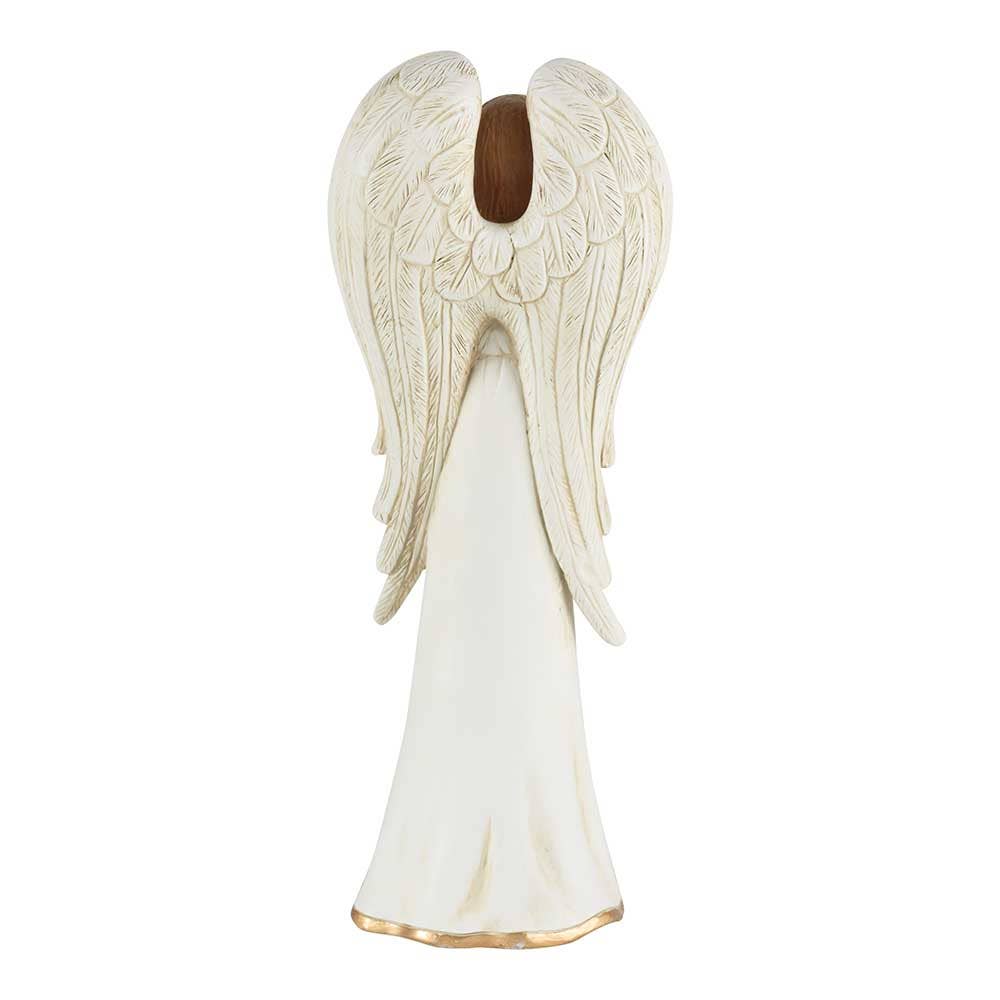 Hem of robe is trimmed in a gold tone. Her wings have nicely detailed feathers front and back. Figurine is resin; height is 8 3/8in, width side to side is 3 1/4in, and depth front to back is 1 3/4in.