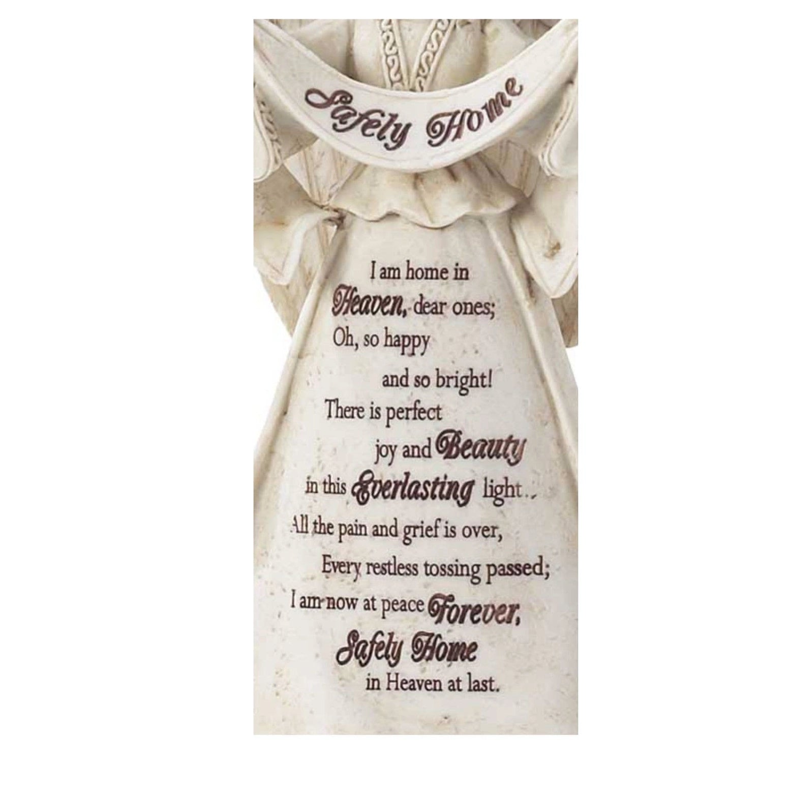 With a light stone-like finish, this petite memorial angel is engraved with words from the beautiful poem Safely Home. It's like seeing words spoken by your loved one who is now enjoying the radiance of Heaven. With her graceful wings and serene expression, she will bring a sense of comfort and reassurance every time you look at her. She is 6 1/2" tall and made of resin.